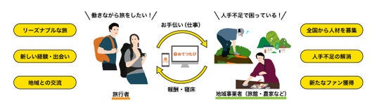 「お手伝い(短期アルバイト)」と「旅」を組み合わせた人材マッチングサービスです。人手不足に悩む地域事業者と、働きながら旅を楽しみたい旅行者をマッチングしています。