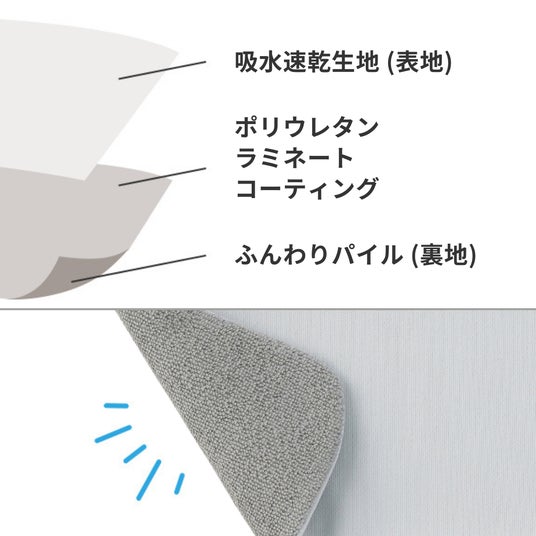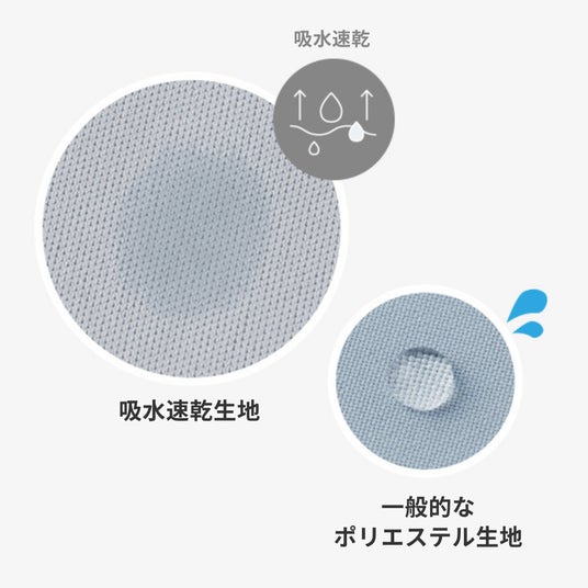 吸水速乾生地は素早く水分を吸収して拡散するため、従来のポリエステルよりも乾きやすい生地です。さらっとドライな質感はお肌に触れたとき心地よく、気温の高いこれからの時期に特におすすめ。裏面には水分が染み出しにくいコーティング付きのパイル地を使用し、お好みに合わせてリバーシブルでお使いいただけます。洗濯機で洗えて、乾きも早く、お手入れ簡単なのもうれしいポイント。