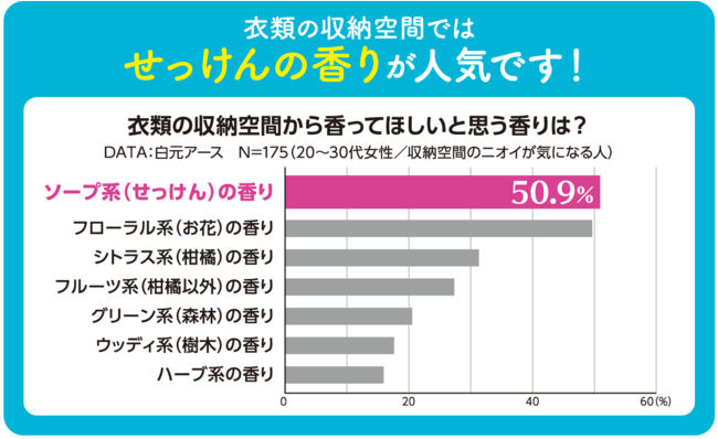「スタイルメイト」は、20~30代の女性に向けた衣類・収納空間ケアブランドです。今回、当社が収納空間のニオイが気になっている人に“衣類の収納空間から香ってほしいと思う香り”についてアンケート調査を行ったところ、約半数がソープ系の香りと回答しました(下図参照)。