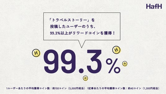 「トラベルストーリー」投稿後、リワードコインの付与までには一定の時間を要しますが、2024年12月末までに「トラベルストーリー」を投稿したユーザーのうち、99.3%に対してリワードコインが付与されており、多くのユーザーがこの仕組みを活用しています。