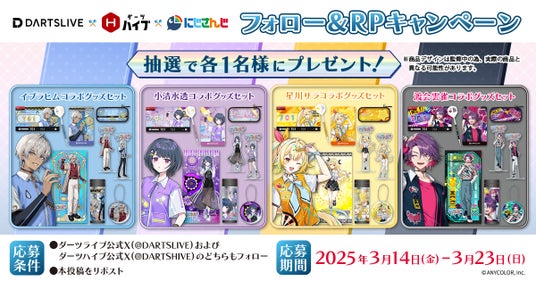 ライバーごとのコラボグッズの詰め合わせセットが当たるSNSキャンペーンを、ダーツライブとダーツハイブの合同で実施します。ぜひご参加ください。