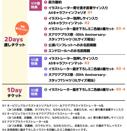 以下の販売サイトにて、本日10月5日(土)より大アクアプラス祭のチケット一般販売を開始しました。SS席は「イラストレーター箔押しサイン入り A5キャラファインマット」(2Days通しチケット特典)や「イラストレーター描き下ろしミニ色紙6種セット」(2Days通しチケット・1Dayチケット共通)など豪華購入特典付きです。チケット販売は先着順になります。