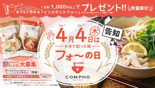 シマダハウス株式会社(東京都渋谷区、代表:島田成年)が運営するCOMPHO(コムフォー)は2024年4月4日(木)にフォーの日にちなみ、コムフォー各店舗で1会計1,000円以上でおうちで作れる「 インスタントフォー 」(鶏だしのフォーか、チリトマトのフォーいずれか)をプレゼントいたします。
