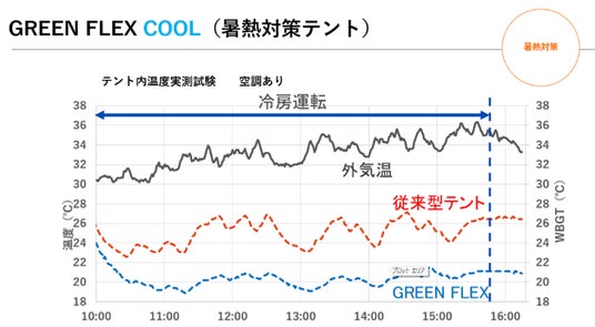 「GREEN FLEX」は幅6mで医療拠点としても機能する大型テントです。奥行きは2m単位でフレキシブルに伸ばしていくことができます。SPACECOOL社が開発した放射冷却性能を持つ光学フィルムを使用した新しい膜材「REI KEEP」(カンボウプラス株式会社製)を使用することで、外気の影響を受けにくい室内環境を実現。高温環境下でもテント内の温度上昇を抑え、避難生活や医療活動における快適性の向上に寄与します。さらに、用途や気候に応じて保温性能の高い膜材に交換することで、寒冷地にも対応可能です。将来的には、膜屋根への搭載を想定した太陽光発電モジュールの活用により、外部電源に依存しない冷却装置の稼働も視野に入れています。なお、検証段階として太陽光発電モジュールをテント上に設置 する実証試験を実施しており、今後は膜材と一体化した形での実装に向けた技術開発を進めていきます。避難生活における快適性や安心感の向上など、“ウェルビーイング”の観点からの環境改善にも寄与します。