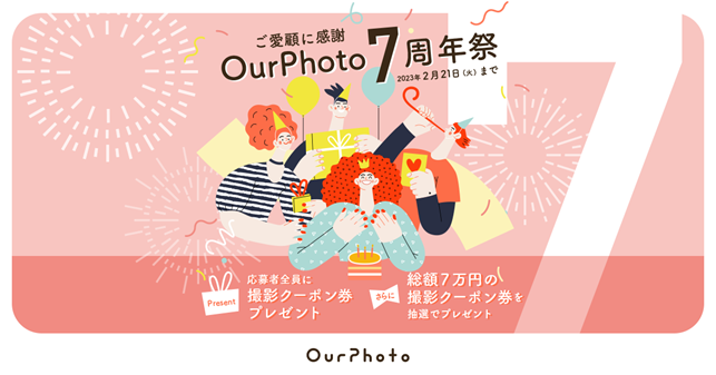 労働力不足問題解決のリーディングカンパニーとして、複数のSaaSを展開する株式会社うるる(東京都中央区 代表取締役社長:星 知也、以下「うるる」)の100%子会社、OurPhoto株式会社(東京都中央区 代表取締役:田中 偉嗣、以下「OurPhoto」)は、出張撮影サービス「OurPhoto」提供開始から7周年を記念し、応募者全員に撮影クーポンを配布する還元キャンペーン「OurPhoto 7周年祭」を、2023年1月23日(月)~2月21日(火)の期間、開催いたします。