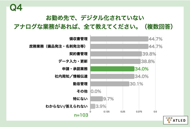 「Q4.お勤め先で、デジタル化されていないアナログな業務があれば、全て教えてください。(複数回答)」(n=103)と質問したところ、「申請・承認業務」は34.0%と約3社に1社がアナログでの運用という回答となりました。