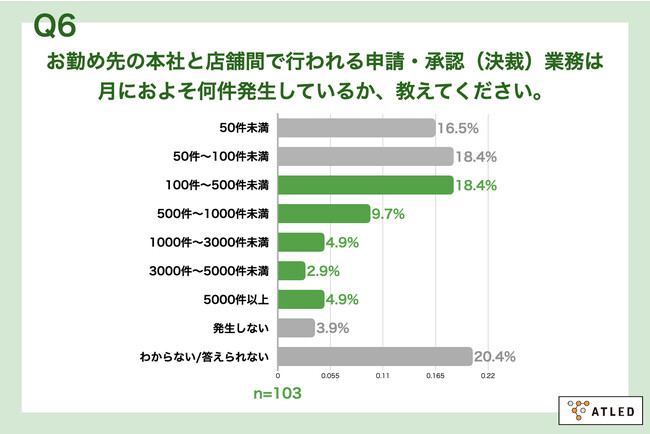 「Q6.お勤め先の本社と店舗間で行われる申請・承認(決裁)業務は月におよそ何件発生しているか、教えてください。」(n=103)と質問したところ、「100件~500件未満」が18.4%、「500件~1000件未満」が9.7%という回答となりました。