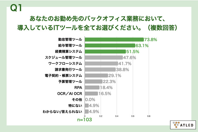 「Q1.あなたのお勤め先のバックオフィス業務において、導入しているITツールを全てお選びください。(複数回答)」(n=103)と質問したところ、「勤怠管理ツール」が73.8%、「給与管理ツール」が63.1%、「経費精算システム」が51.5%という回答となりました。