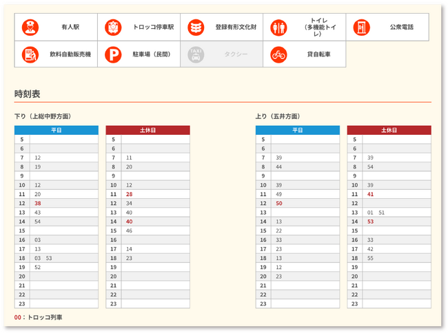 ■各駅の利用可能設備をアイコン化し、 時刻表も駅ごとに整理して掲載