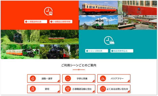 路線内各駅の詳細な情報や時刻表、お得な切符情報、ハイヤー・タクシー情報など、鉄道の利用者にとって有益な各コンテンツについて利便性強化にむけたUIの改善を行い、またそれらをTOPページ最上段のグローバルナビゲーションにまとめることでいつでもスムーズに利用できるよう、サイト構造を大幅に見直しました。