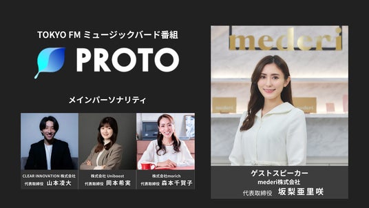 オンラインピル診療サービス『mederi Pill(メデリピル)』を提供するmederi株式会社(本社:東京都目黒区、代表取締役 坂梨 亜里咲 以下、mederi)は、CLEAR INNOVATION株式会社が運営するラジオ番組『PROTO』にゲスト出演することが決定しました。