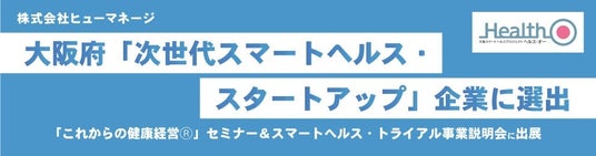 人材の“採用”から“定着”、その先の“活躍”までを支援する人材サービス事業を展開する株式会社ヒューマネージ(本社:東京都千代田区、代表取締役社長:齋藤 亮三)は、大阪府「次世代スマートヘルス分野のスタートアップ対象企業」に選出されました。2025年2月13日(木)、梅田・ハービスホールで開催される「これからの健康経営(R)*1」セミナー&スマートヘルス・トライアル事業説明会に出展いたします。