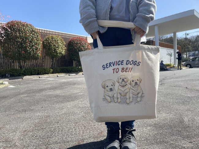 介助犬のチャリティーグッズは毎年実施している協会の主催イベント「介助犬フェスタ」に合わせて新グッズを作成している。今年の新グッズは、Tシャツやトレーナなどの衣類、巾着袋やタンブラーなどの小物を揃えている。その中の目玉商品は介助犬サポート大使でもあるジュディ・オングさんにデザインを描いていただいたトートバッグである。