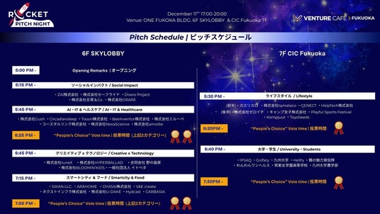 CIC Japan(本社:東京都港区、創業者兼CEO:ティム・ロウ)が運営する Venture Cafe Fukuoka が2025年12月11日に ONE FUKUOKA BLDG.(ワン・フクオカ・ビルディング) SKY LOBBYで「 ROCKET PITCH NIGHT FUKUOKA 2025 」を初開催いたします。