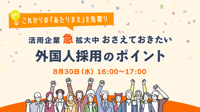 働くに関する社会課題をビジネスで解決するキャムコムグループの株式会社天職市場(本社:東京都港区浜松町、代表取締役:春名敬太、以下 天職市場)は、2023年8月30日(水) 16:00~17:00に、採用担当者向けオンラインセミナー『活用企業急拡大中 おさえておきたい外国人採用のポイント』を開催いたします。