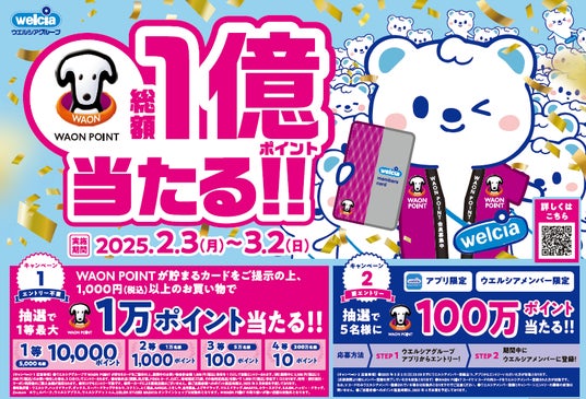ウエルシア薬局株式会社(本社:東京都千代田区、代表取締役社長:田中純一、以下 ウエルシア薬局)は、2025年2月3日(月)より、WAON POINTが総額1億ポイント当たる!!キャンペーンをスタートします。