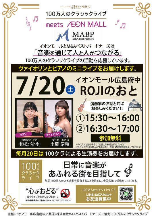 製造、建設、不動産、医療・ヘルスケア、物流、ITに特化したM&A仲介を行う株式会社M&Aベストパートナーズ(本社:東京都千代田区、代表取締役社長:齋藤 達雄 以下M&Aベストパートナーズ)は、イオンモール広島府中にて、クラシックライブ(協力:一般財団法人100万人のクラシックライブ 以下100万人のクラシックライブ)を、7/20(土)に開催することをお知らせいたします。