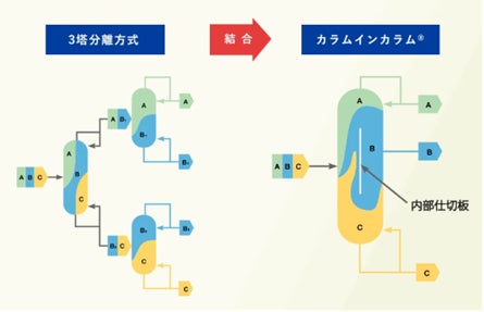 一般的な多成分系蒸留システムでは、複数の蒸留塔を連ねることで分離を行っていますが、各蒸留塔で加熱・冷却を繰り返しているため、蒸気・熱媒・冷却水等のユーティリティの使用量が多くなりランニングコストが大きくなります。これに対し、カラムインカラム(R)は、蒸留塔の内部に塔を垂直に分割する仕切板(しきりいた)を設置する構造とすることで、複数の蒸留塔の機能を1塔に統合し、ユーティリティ使用量の削減に寄与します。