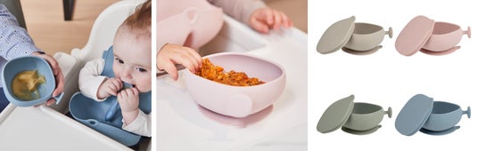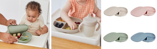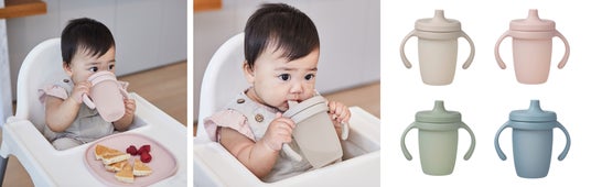 これらのアイテムはすべて、高い安全性を誇るBPA、フタル酸エステル類、およびPVCフリーのシリコン素材で作られています。ボウルには離乳食初期にママやパパのサポートを楽にする持ち手がついており、ボウルとプレートにはひっくり返らないように吸盤がついています。さらに、スパウトカップは成長に合わせてコップ飲みができるように設計されています。