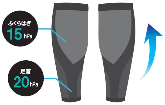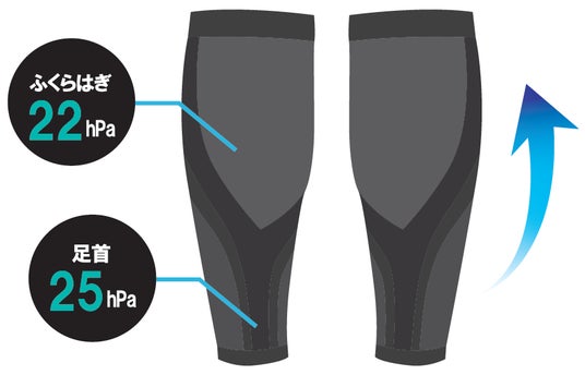 足首からふくらはぎに向かって段階的に着圧値が低くなる設計