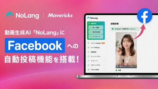 日本発・国内最大級(※)の動画生成AIサービス「NoLang(ノーラン)」を提供する株式会社Mavericks(本社:東京都文京区、代表取締役社長:奥野 将太)は、NoLangで生成した動画をFacebook Pageへ直接投稿できる「Facebook Page連携機能」の提供を開始しました。本機能により、AIによる動画の自動生成からFacebook Pageへの投稿・公開設定までをNoLang上でシームレスに完結させることが可能になります。Facebookは実名制により信頼性の高い情報発信の場として、企業のIR・採用・B2Bマーケティングで広く活用されており、本機能によって動画制作の専門スキルや外注費用をかけることなく、Facebookを活用した継続的な企業情報発信に取り組める環境を実現し、企業の制作コストと運用工数を大幅に削減します。