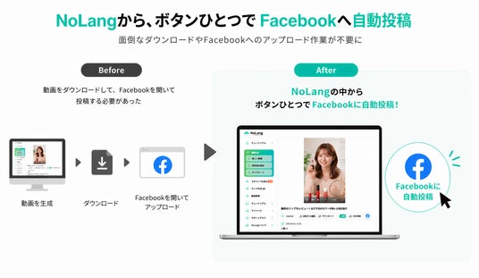国内MAU2,600万人・実名制で信頼性の高いFacebookに、NoLangで生成した動画をダイレクトに投稿。企業のコンテンツ発信力を強化
