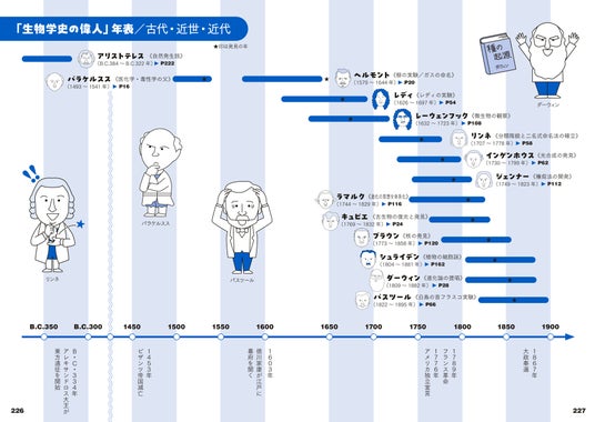 本書では研究者や生物をゆるいイラストで描き、親しみやすく図解します。巻末には「生物学史の偉人」年表や地質年代における生物の歴史を掲載、生物学史を大づかみできます。