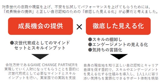 YOMIKOでは、これまでの「受注型ビジネス」から、得意先と共にビジネスを創る「創出型ビジネス」への転換が急務であると考え、「GAME CHANGE PARTNER」をビジョンに設定し、個人と組織の双方が攻めの姿勢を持ち、共に成長する企業へと変革を推進しています。また、広告会社としてははじめての「ワークライフバリューの実現」という働き方を提唱し、社員が自分らしく活躍し、成長できる環境づくりや支援の仕組みづくりを実践。特に離職率の高まりが懸念されていた20代後半から30代前半の社員に対しては、「成長機会の提供」と「徹底した見える化」を重要だと考え、社員がパフォーマンス高く働けるような施策を展開しました。