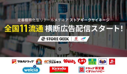 株式会社フリークアウト・ホールディングス(本社:東京都港区、代表者:代表取締役社長 Global CEO 本田謙、以下「フリークアウト」)は、株式会社フェズ(本社:東京都千代田区、 代表者:代表取締役 伊丹順平、以下「フェズ」)との合弁会社であり子会社の株式会社ストアギーク(本社:東京都港区、代表者:代表取締役 廣瀬隆昌、以下「ストアギーク」)により2023年10月に提供開始したリテールメディアサービス「ストアギークサイネージ」が、大手ドラッグストアチェーンである株式会社ツルハホールディングス(本社:北海道札幌市、代表者:代表取締役社長執行役員 鶴羽 順)、ウエルシアホールディングス株式会社(本社:東京都千代田区、代表者:代表取締役社長 松本 忠久)、株式会社キリン堂(本社:大阪府大阪市、代表者:代表取締役社長 執行役員 寺西 豊彦)、株式会社新生堂薬局(本社:福岡県福岡市、代表者:代表取締役社長 水田 怜)が運営する店舗に導入されましたので、お知らせいたします。