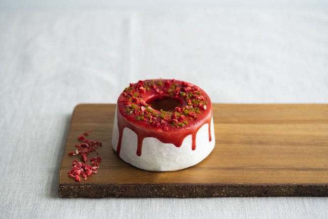 シフォンケーキの上に、苺とフランボワーズを使用した甘酸っぱいベリーソースが「とろっと」かかっています。甘くなり過ぎないよう、隠し味にラム酒を少量加え、すっきりとした味わいに仕上げました。フリーズドライの苺と刻んだピスタチオをトッピング。ソースの赤みが映える、華やかで美しいシフォンケーキです。