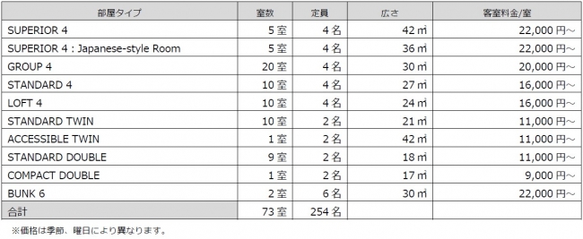 客室は、ストレージ空間の雰囲気を引き継ぎなら、落ち着きと心地良さを感じる素材や色で設計しました。個室タイプ10種類73室をご用意。定員2名、4名の客室を中心に6名部屋まで様々なバリエーションの客室をご用意しております。