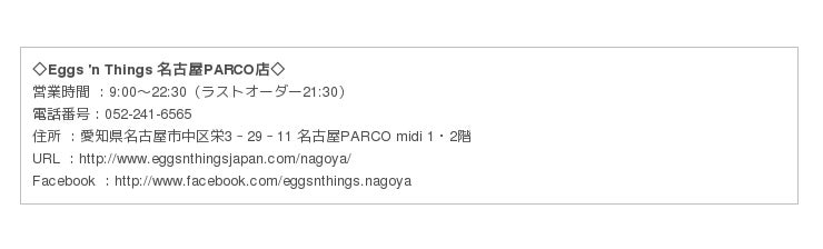 名古屋PARCO店 :https://www.facebook.com/eggsnthings.nagoya