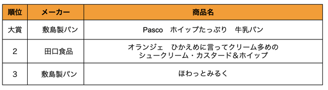 また、総合第2位は「田口食品 オランジェ ひかえめに言ってクリーム多めのシュークリーム・カスタード&ホイップ」、第3位は「敷島製パン Pasco ほわっとみるく」(終売)が受賞し、2023年の上半期は菓子パンが総合大賞と3位を占める結果となり、菓子パンへの注目が集まることになりました。