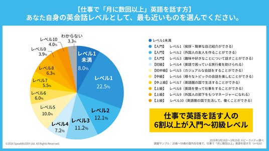 ・一方で、仕事で英語を話す人の61%は「入門~初級レベル」