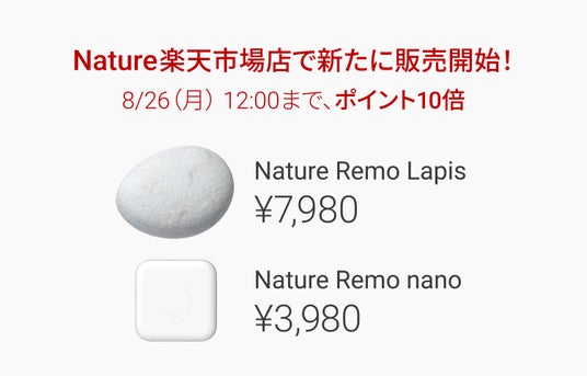 「自然との共生をドライブする」をミッションに掲げるNature株式会社(所在地:神奈川県横浜市、代表取締役:塩出 晴海、以下「Nature」)は、次世代スマートリモコン「Nature Remo Lapis(ネイチャーリモラピス)」と「Nature Remo nano(ネイチャーリモナノ)」を、2024年8月20日(火)正午より、楽天市場にて販売を開始いたします。また、「Nature楽天市場店」での販売開始キャンペーンとして8月20日(火)から8月26日(月)まで、楽天ポイントを10倍といたします。この機会をぜひお見逃しなく。