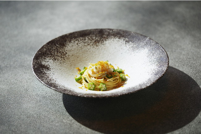 パスタ料理には、平木が五島うどんの製造者を訪ねた際に出会った五島手延べスパゲッティを使いました。セモリナ粉100%を水と塩、五島産の椿オイルのみで作られたスパゲッティをアーリオオーリオにし、五島の旬の魚を五島の椿から抽出された酵母と麹で発酵させた魚醤、“烏賊の王様”と名高い障泥烏賊を「五島の醤」の大豆麹であえてオクラと加え、自家製のボラのボッタルガをトッピングし、五島の食材の豊かさを表現しました。