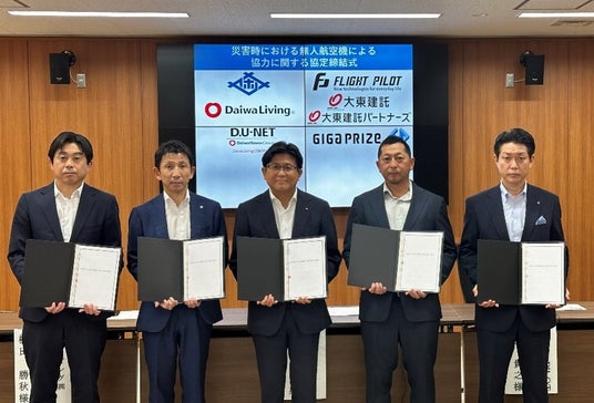 株式会社Flight PILOT(長崎県佐世保市、代表取締役:川上 貴之)と大和リビング株式会社(東京都新宿区、代表取締役社長:匝瑳 繁夫)及びD.U-NET株式会社(東京都新宿区、代表取締役:匝瑳 繁夫、以下二社を併せて「大和ハウスグループ」)、大東建託株式会社(東京都港区、代表取締役 社長執行役員 CEO 竹内 啓)及び大東建託パートナーズ株式会社(東京都港区、代表取締役社長:守 義浩、以下二社を併せて「大東建託グループ」)、株式会社ギガプライズ(東京都渋谷区、代表取締役社長 佐藤 寿洋)は、佐世保市(市長:宮島 大典)と「災害時における無人航空機(ドローン)による協力に関する協定(以下「本協定」)」を締結いたしました。