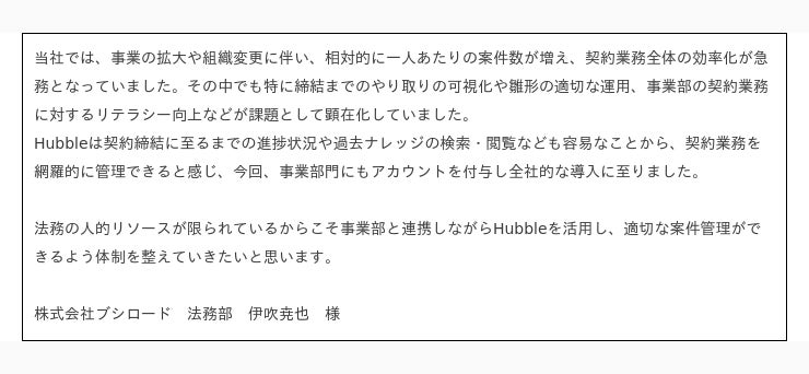 株式会社Hubble(東京都渋谷区、CEO:早川晋平)が提供する契約書管理クラウドサービス「Hubble(ハブル)」が、株式会社ブシロード(本社:東京都中野区、代表取締役社長:木谷高明、証券コード:7803)に正式導入され、本格運用が開始されました。
