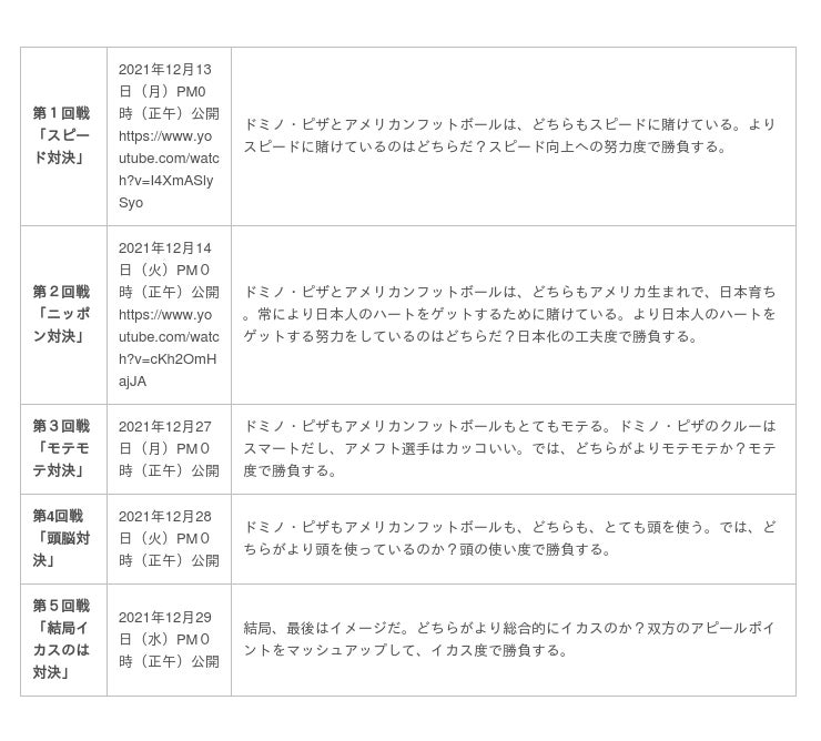 「スピード」、「ニッポン」、「モテモテ」、「頭脳」、「総合イカス度」の5つのテーマで、それぞれのアピールポイントをまとめたショート動画をYouTubeに12月13日より投稿。それを受けて、ドミノ・ピザ公式Twitterで、ドミノ・ピザが勝っているか、アメフトが勝っているかのTwitter投票を呼びかけていきます。