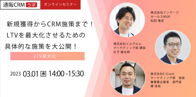 顧客対応クラウド『Re:lation(リレーション)』を開発・提供する株式会社インゲージ(本社:大阪府大阪市、代表取締役CEO:和田 哲也、以下インゲージ)は、株式会社イルグルム、株式会社E-Grantとの共催セミナー「新規獲得からCRM施策まで! LTVを最大化させるための具体的な施策を大公開!」を3月1日(水)にオンラインにて開催いたします。