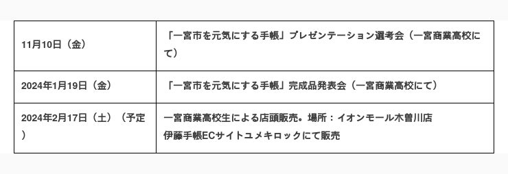11月10日に9チーム対抗のプレゼン選考会を一宮商業高等学校にて行います。選考会で最優秀に選ばれた手帳案を伊藤手帳が製品化します。製品化した手帳は2024年1月19日(金)一宮商業高等学校にて完成品発表会が行われ、2024年2月17日(土)イオンモール木曽川店で同校の生徒が販売を行う予定です。また、伊藤手帳のECサイトユメキロックでも同時に販売します。
