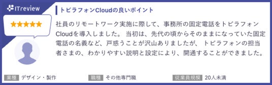 「トビラフォン Cloud」は「ITreview」で平均顧客満足度4.2を獲得しています(2024年10月16日時点 75レビュー)。当製品のご利用者様から実際に寄せられたレビューを一部ご紹介します。