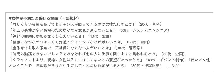 「不利だと感じたことがある」と回答した人に、どんなときに不利だと感じたか聞いたところ、「自分らしく働けていない」と回答した人の理由と同様、「男性社員同士(上司と部下)の方が話がしやすい雰囲気があり、新しい案件の話がきても情報が流れてこないとき」(40代・企画)、「発言権がなく、言いなりに業務をこなすしかできないとき」(30代・事務)など、男性優位のため対等に扱われない場面を挙げる意見が多く集まりました。また、「男性社員と同じ成績だったが、女性は結婚・出産があるからとの理由で出世できなかったとき」(20代・事務)、「結婚・出産にあたり、女性だからすぐやめる、フルタイム稼働できないことを理由に、高度な案件やポジションを見送られたとき」(30代・営業)など、結婚や出産などを理由にキャリアアップや、仕事のチャンスを失ったという意見も多く挙がりました。
