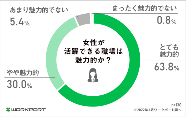 まず、働く女性が「女性活躍推進」に関してどんなイメージを抱いているのかを知るために、対象者全員に女性が活躍できる職場は魅力的か聞いたところ、「とても魅力的」が63.8%、「やや魅力的」が30.0%と、「魅力的だ」と回答した人が93.8%に上りました。