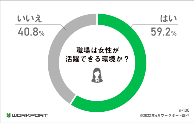 対象者全員に、現在の勤務先(離職中の人は直近の勤務先)は女性が活躍できる環境だと感じるか聞いたところ、「活躍できる環境だ」と回答した人が59.2%と半数を超えました。