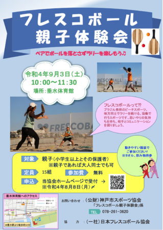 参加費無料。主催は神戸市スポーツ協会で、HPで事前受付。JFBAは、関西フレスコボール協会と連携し、ブラジル・リオデジャネイロの姉妹都市・神戸市におけるフレスコボールの普及活動を進めてまいります。