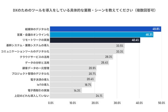 2)次に、DXのためのツール導入状況を確認したところ、「紙媒体のデジタル化」が49.8%、「営業・会議のオンライン化」が46.3%、「リモートワークの実施」が40.4%と回答。次に「基幹システム・業務システムの導入」は33.5%となった。