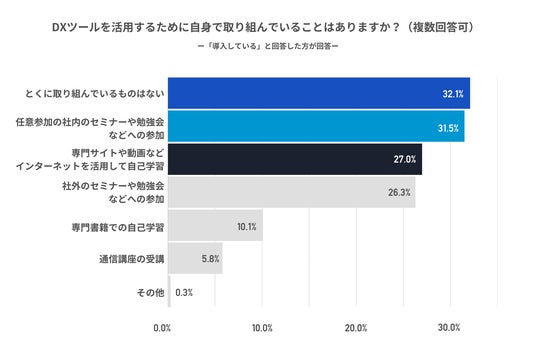 ● DXツールを活用するために「自身でとくに取り組んでいるものはない」と回答した人は3割程にとどまり、多くの人がセミナー参加や自己学習など積極的に取り組んでいる。