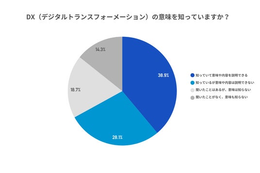 1)まず、DXの意味を知っているか聞いたところ、「知っていて意味や内容を説明できる」が38.9%で最も多く、次いで「知っているが意味や内容は説明できない」が28.1%、「聞いたことはあるが、意味は知らない」が18.7%、「聞いたことがなく、意味も知らない」が14.3%となった。