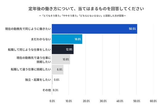 6)5)で働き続けたいと回答した方にどのように働きたいか聞いたところ、「現在の勤務先で同じように働きたい」が50.5%で圧倒的に多く、次いで「まだわからない」が18.0%、「転職して同じような仕事をしたい」が12.9%となった。